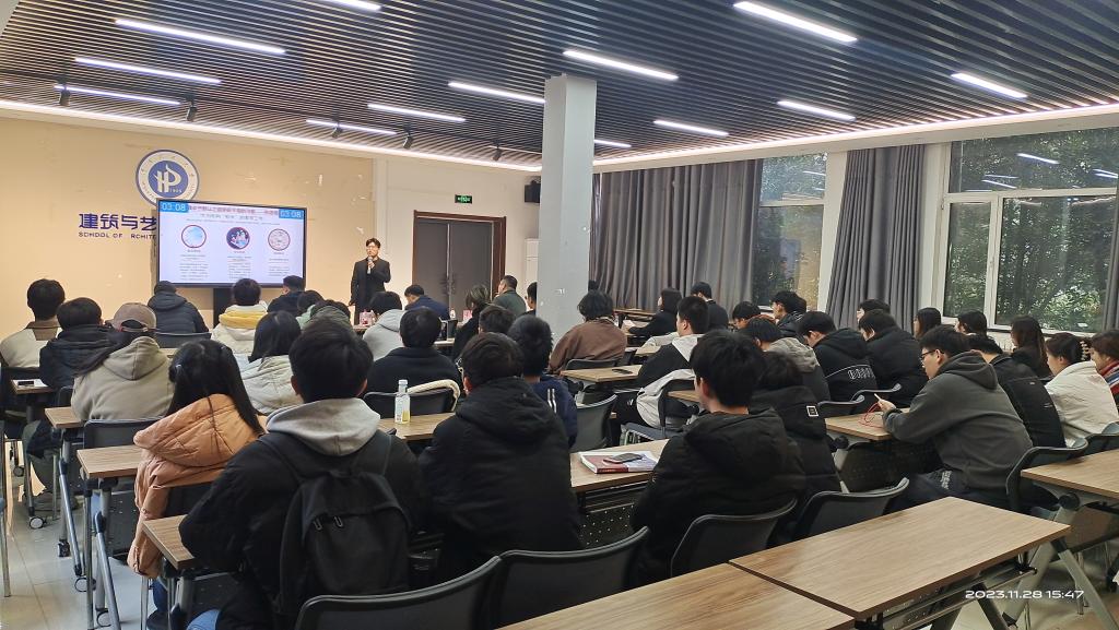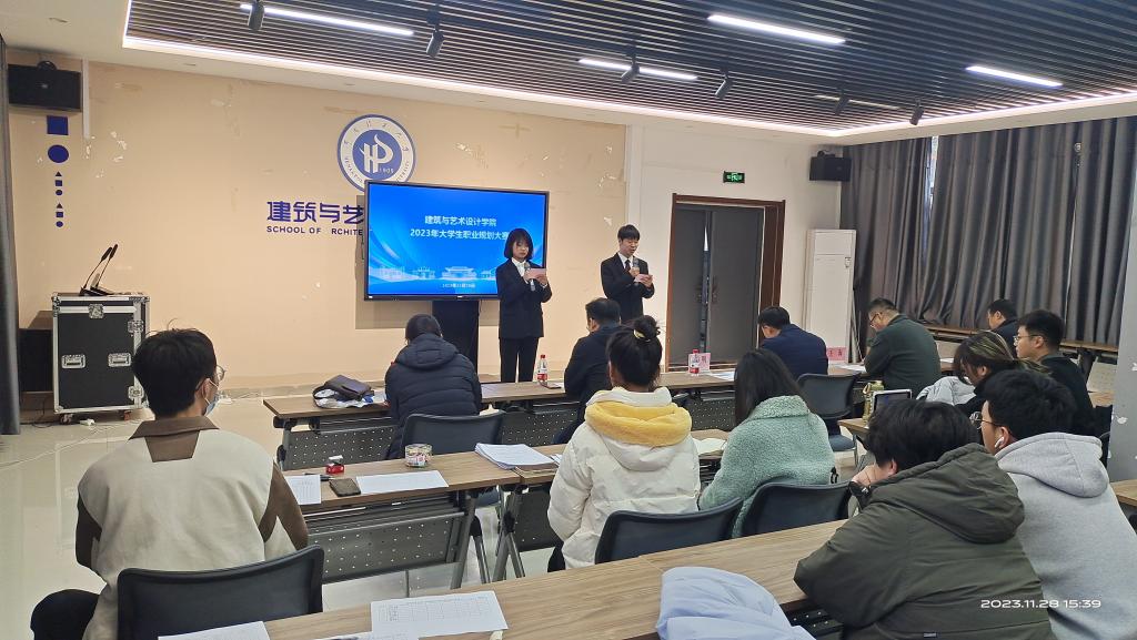 在晓书楼大会议室举办2023年“筑梦青春志在四方,规划启航职引未来”大学生职业规划大赛。院党委副书记张明、城市规划专业支部书记张运兴、视觉传达专业系主任王海、环境设计专业系主任王维天、工业设计专业系主任周敏作为评委老师出席了本次大赛。