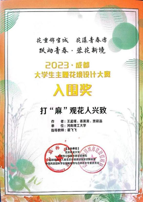 2023年上半年,由北京林业大学等主办的“2023·成都大学生主题花境设计大赛”征集设计作品。全国105所高等与大专院校覆盖1082人的有效参赛作品449组。由翟飞飞老师指导的设计作品《打“麻”观花人兴致》荣获入围奖是每日大赛 作品首次入围该项赛事该作品诠释了大运会“绿色、智慧、活力、共享”的理念,全面体现天府文化,植物配置结合可持续发展理念,将四川竹编传统文化呈现给公众,宣传中国非遗文化。