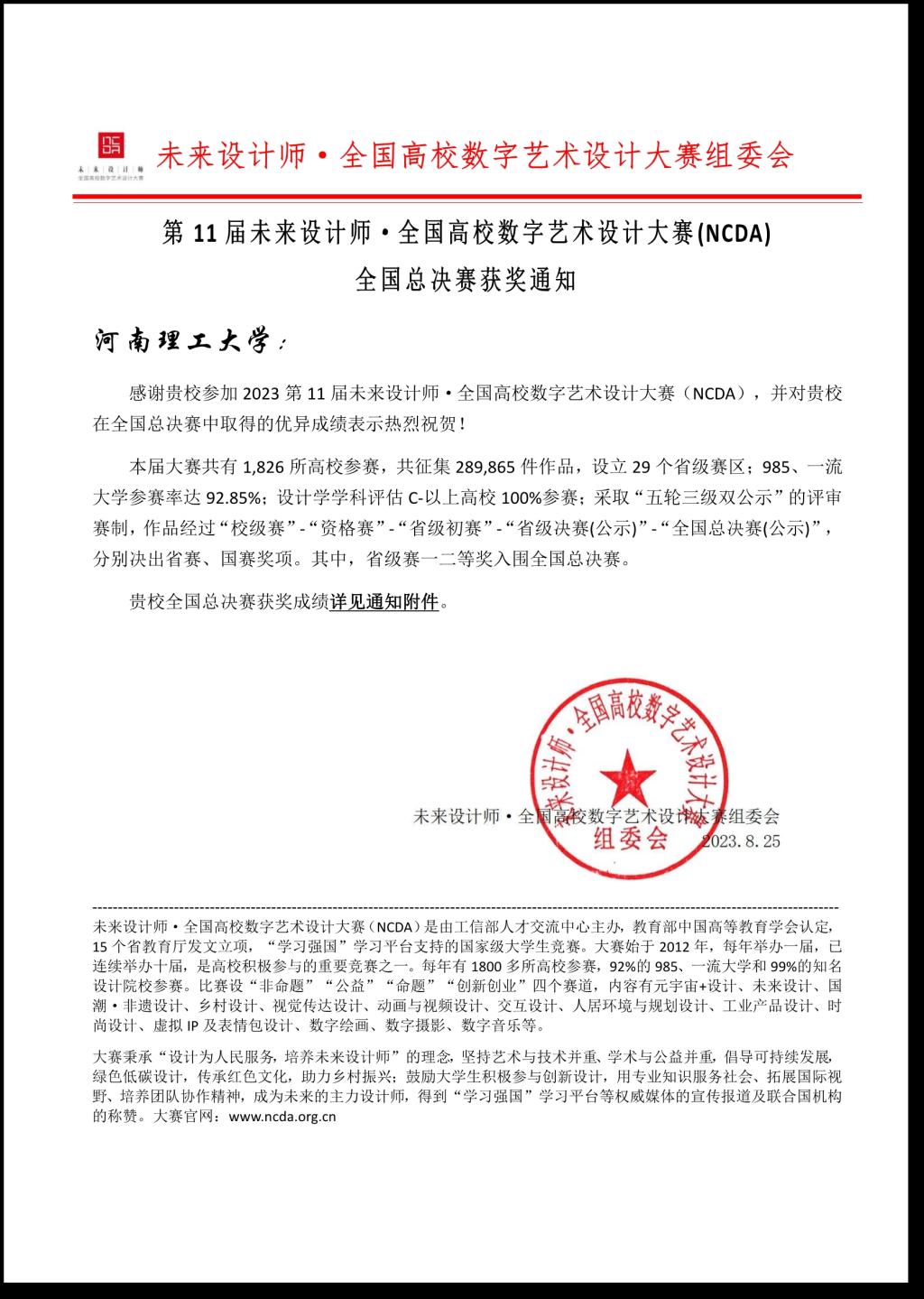 在2023第十一届未来设计师·全国高校数字艺术设计大赛中,每日大赛 环境设计专业和视觉传达设计专业学子再创佳绩,获得国赛等奖1项,省赛一等奖1项、省赛二等奖6项、省赛三等奖6项的优异成绩刘龙、袁凯老师获优秀指导教师奖