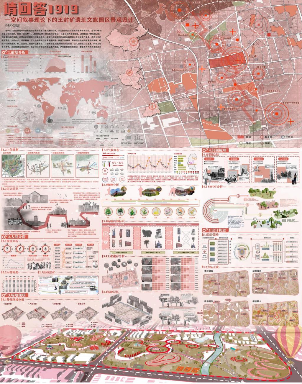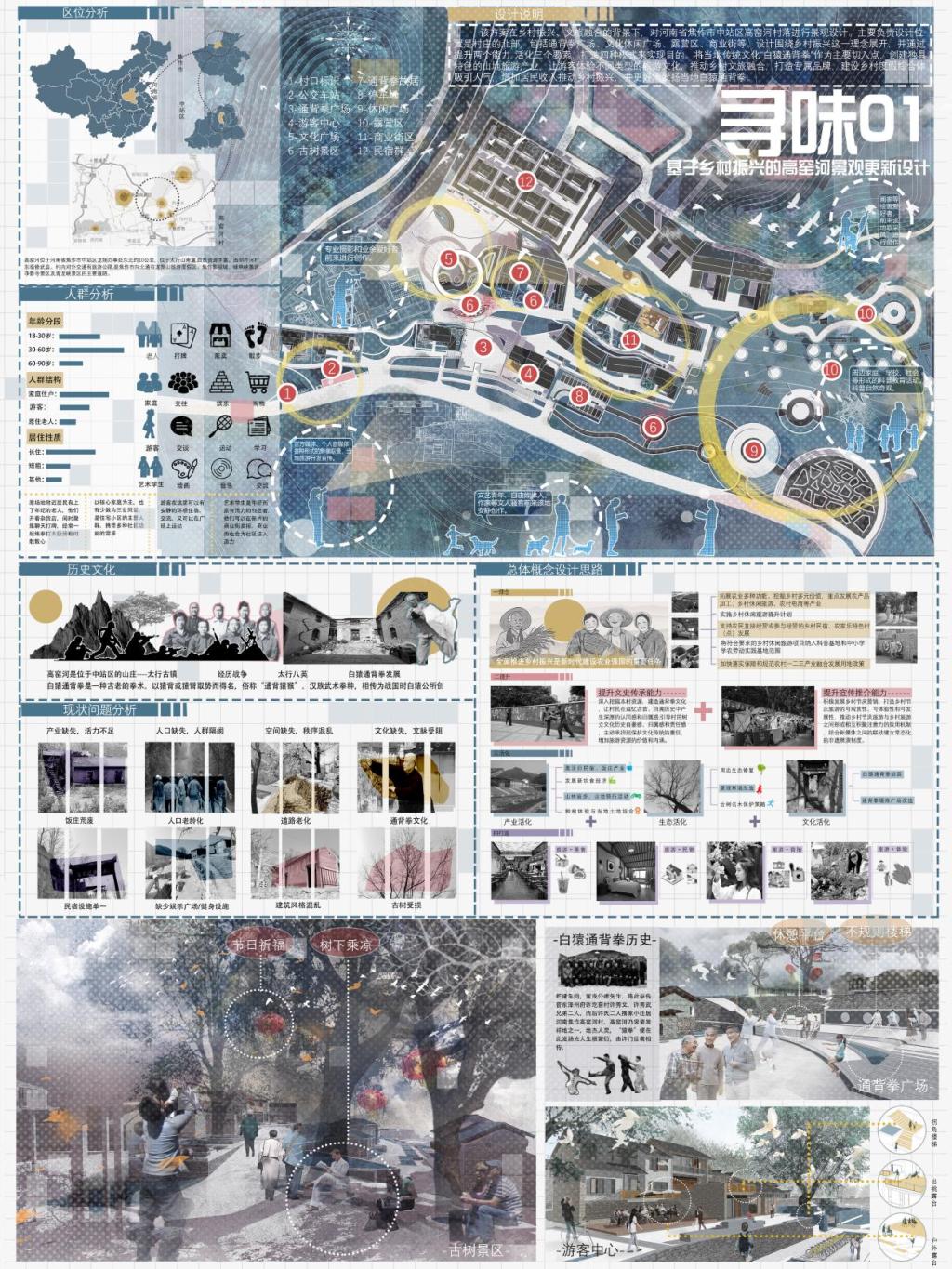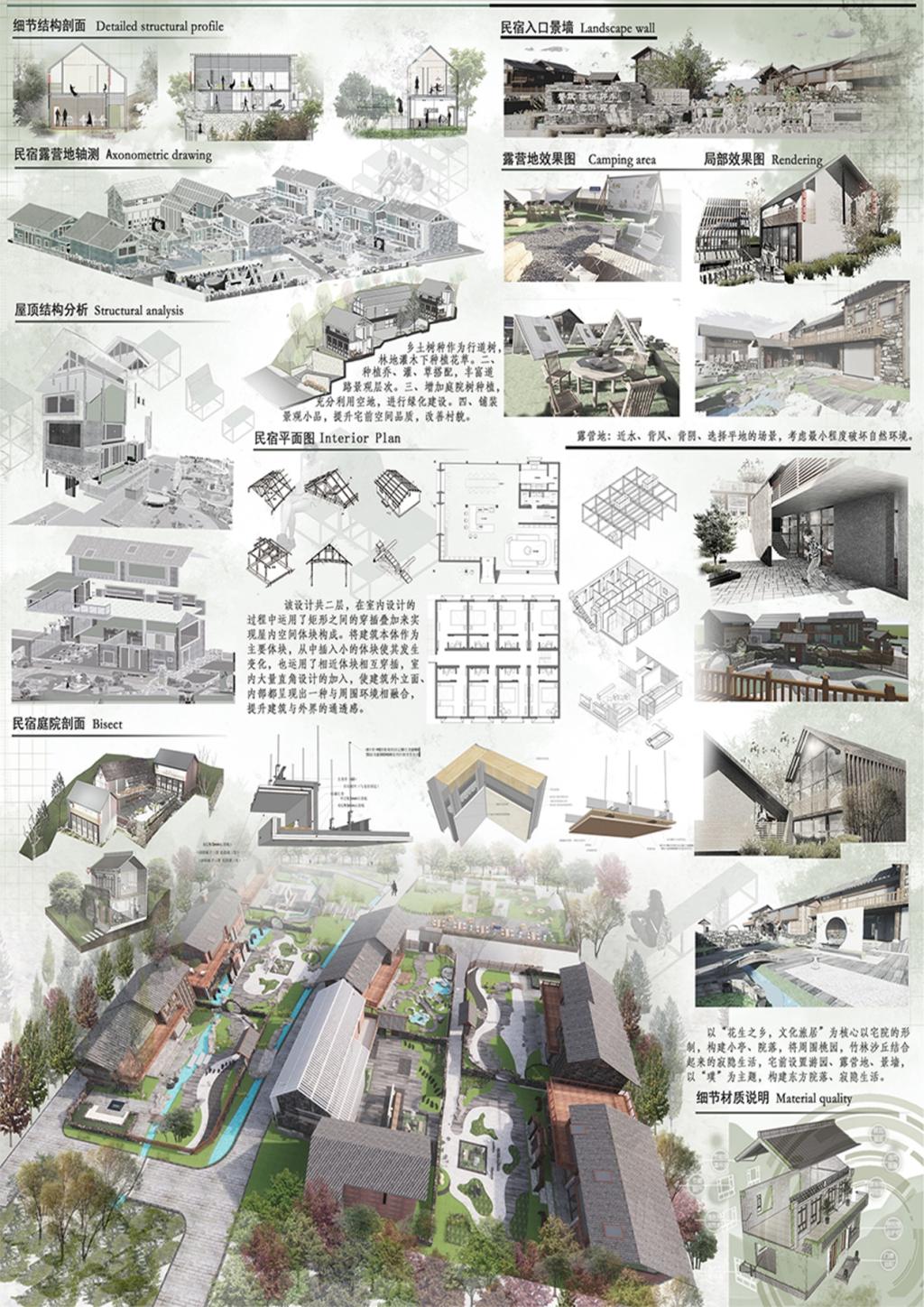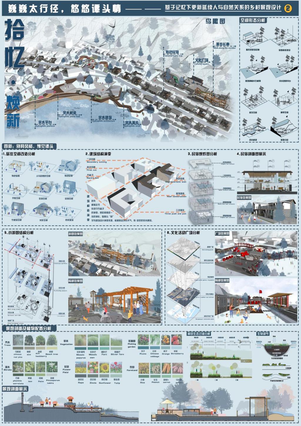 樊泽鑫等三位同学的作品“沁古叠今——集璞舍”获得国赛等奖,该作品基于韧性视角的乡村更新设计,以武陟县中封村文旅产业发展为例,以“璞”为主题,构建东方院落、寂隐生活。以“花生之乡,文化旅居”为核心,以宅院的形制,构建小亭院落顺应当下的生活方式,从衣食住行的生活方式中探寻文化旅居更多的可能性,结合当地民族文化实现韵味提升,在打造新旧融合的过程中保留本土韵味。