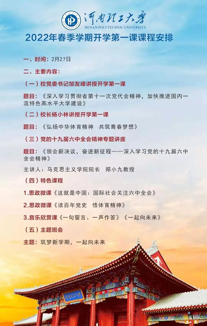 本网讯(记者 芦晓伟 通讯员 康伟然)为深入贯彻习近平总书记关于“大思政课”建设的重要指示精神,根据河南省高校工委、河南省教育厅关于上好2022年春季思政开学第一课的工作安排和学校常态化疫情防控相关要求,2月27日至28日,在全体本专科生、研究生返校后,学校2022年春季学期“开学第一课”线上开讲,校党委书记邹友峰、校长杨小林分别作了主题授课。全校学生线上学习了相关视频。