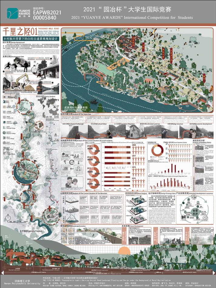 始终围绕乡村振兴特色品牌,在人才培养、科学研究和社会服务方面持续发力。本作品基于乡村振兴背景,选取太行八陉中的白陉古道为对象,在古道沿线选取出8个代表性乡村聚落,结合不同村落的文化、景观等特点进行差异化设计,使古道沿线的乡村聚落与旅游发展形成良性共生关系,提升发展活力。同时,将遗产廊道中深厚的历史人文要素根植于景观规划设计中,提升设计的归属感与认同感。通过规划设计使乡村物质与非物质文化遗产得以保护与利用,以推动农村产业融合发展,提升乡村人居环境和乡村建设品质,打造美丽宜居村庄,延续乡村之美,助力乡村振兴。