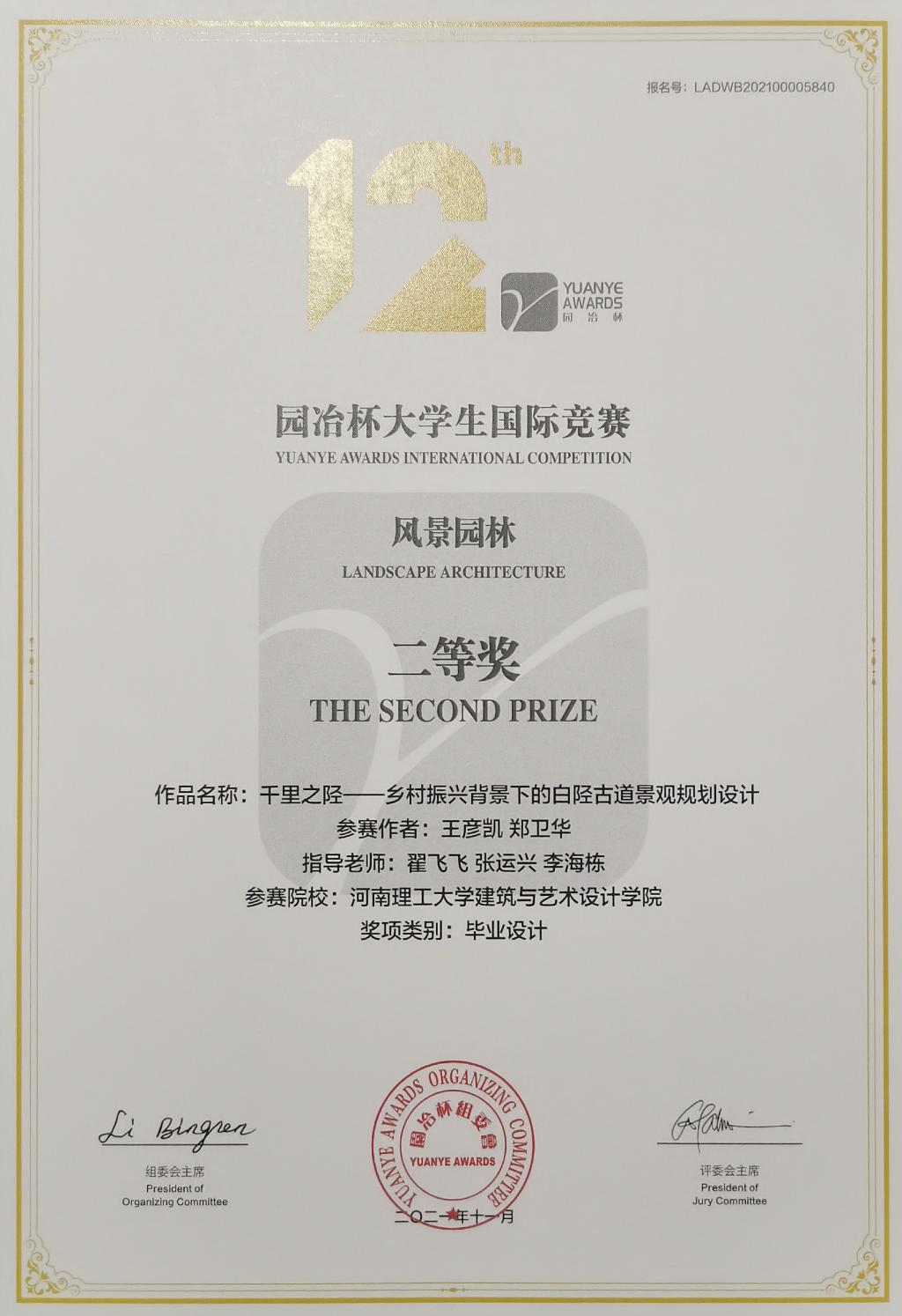 专业教师翟飞飞、张运兴和李海栋共同指导的2021届本科毕业生王彦凯、郑卫华作品《千里之陉——乡村振兴背景下的白陉古道景观规划设计》荣获毕业设计类二等奖,实现每日大赛