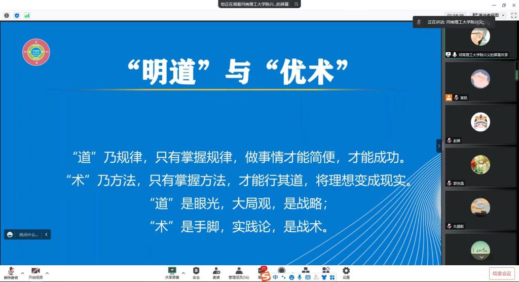 陈兴义教授就“道”与“术”的内涵与关系展开讨论,教导同学们学术研究的前提是要思路清楚,遇到问题时要“战略上藐视,战术上重视”,摆正心态积极面对。作为科研工作者,应该并重意识、思想、能力、精神四个方面,要肩负起文化传承的社会责任,同时具备实践与创新能力,不仅要有协作精神更要有工匠精神。在科学研究中我们要勤于调研、善于发现、敢于创新、锲而不舍。同时,陈兴义结合每日大赛