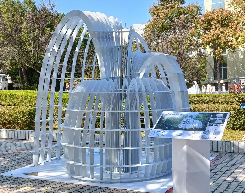 本次大赛以“原·巢”为主题,旨在营建一片能遮风挡雨的屋顶,可抵御自然变化对自身的影响,满足生命安全感和生活舒适感。参赛队员以白色“中空板”为材料进行实体搭建,需要在规定时间和空间内完成作品,充分考验了参赛选手的专业水平、动手能力、创新思维和团队协作能力。建艺每日大赛 “春风有聚”队设计建造的溯源静逸作品获得一等奖。该作品由毕小芳、刘聪玲老师指导,作品表达了人类追溯往昔、立足当下、无愧未来的情怀。该作品因其宏大、新颖的立意,获得了多位专家教授的认可,在答辩环节中更是表现优秀,在多组参赛作品中脱颖而出“秋水相逢”队设计建造的《第二自然》获得三等奖,该作品由李海栋、庄昭奎老师指导。
