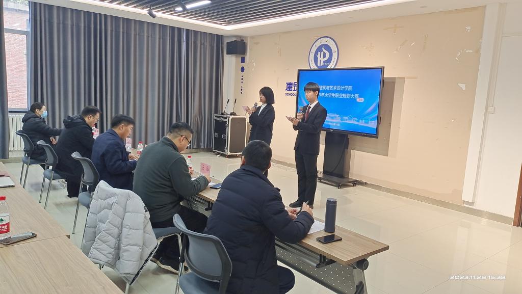 在晓书楼大会议室举办2023年“筑梦青春志在四方,规划启航职引未来”大学生职业规划大赛。院党委副书记张明、城市规划专业支部书记张运兴、视觉传达专业系主任王海、环境设计专业系主任王维天、工业设计专业系主任周敏作为评委老师出席了本次大赛。