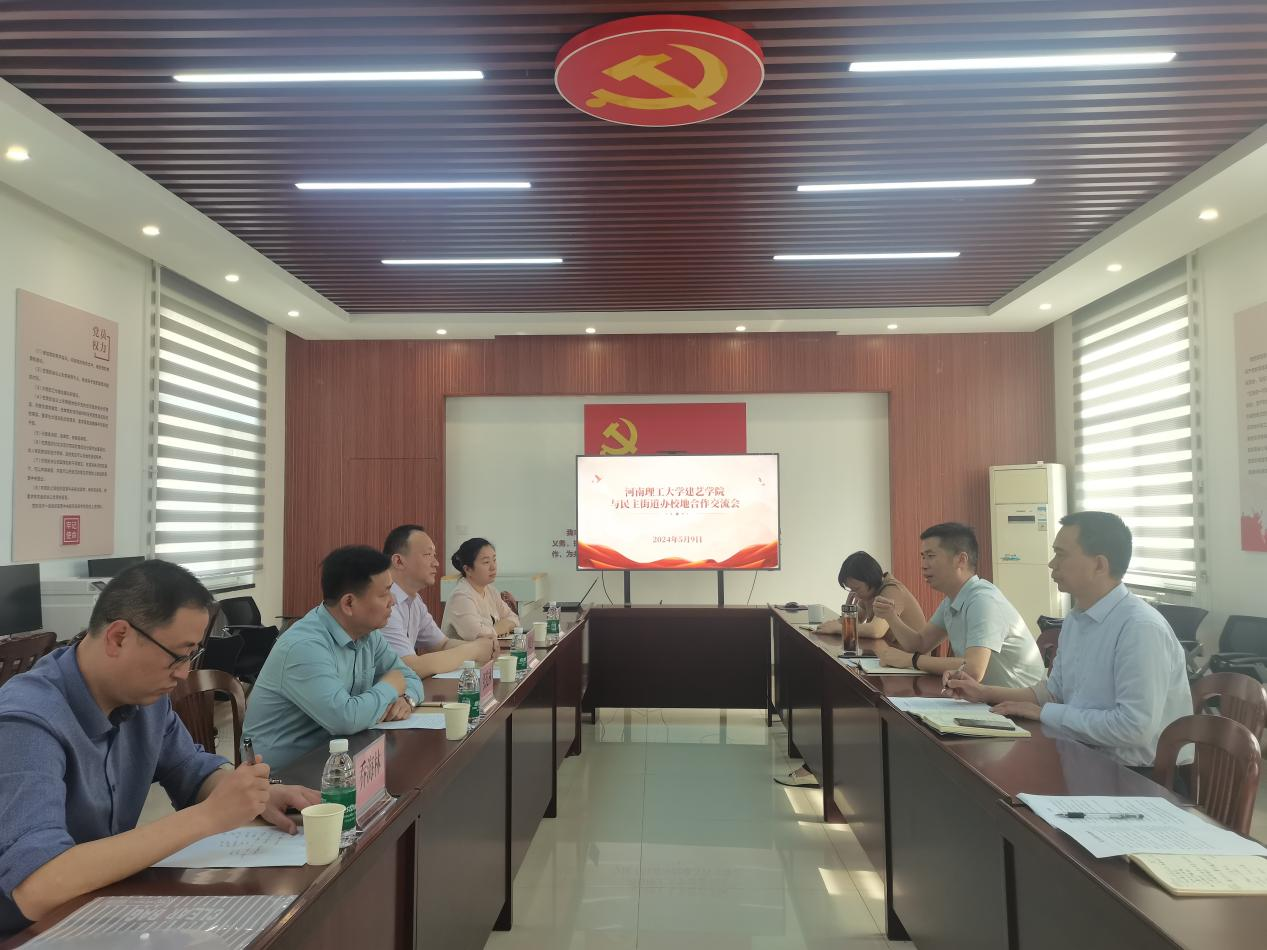 与焦作市解放区民主街道办事处校地合作交流会在党建活动室召开。解放区民主街道党工委书记张乾林、解放区民主街道办事处主任师建平、解放区民主街道纪工委书记乔海林、解放区民主街道综合执法大队队长徐人格,每日大赛