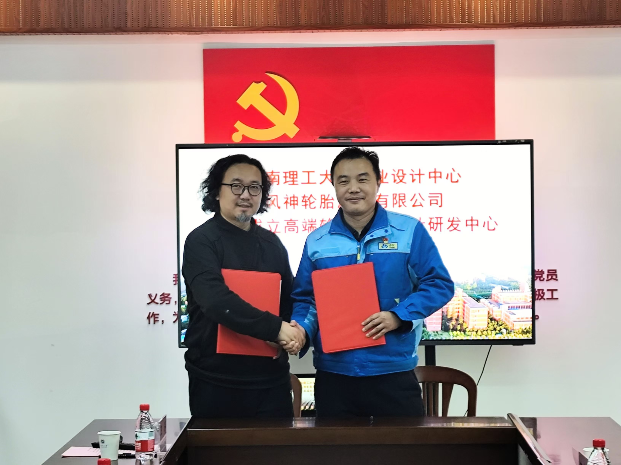 党建会议室举行高端轮胎智能设计研发中心签约仪式。风神轮胎股份有限公司技术中心副CTO王志平、何剑及技术管理部副部长贺李萍,院长王同文、副院长韩宏斌、何艳冰、视觉传达设计系主任王海以及工业设计中心副教授黄晶出席此次签约仪式。