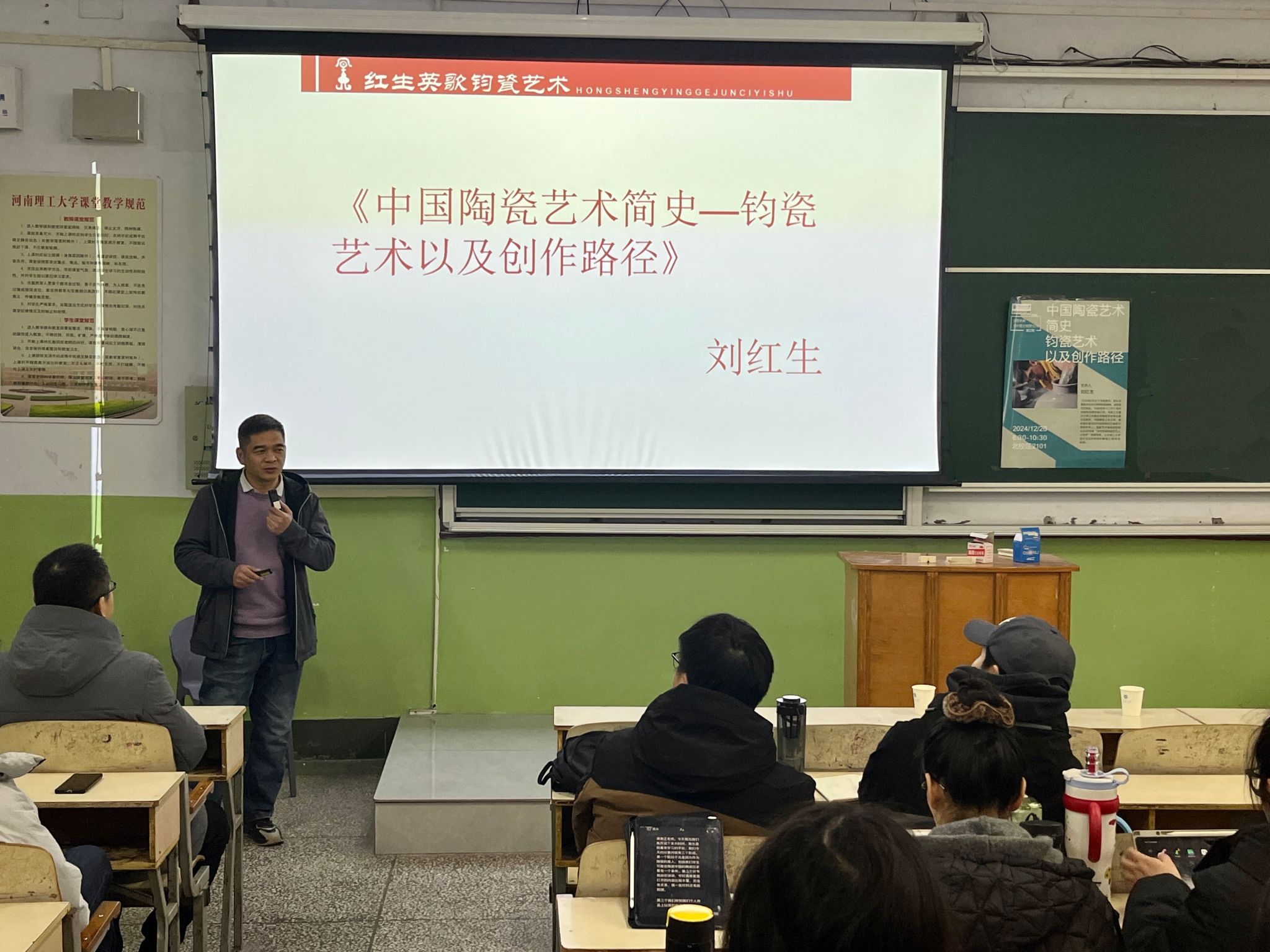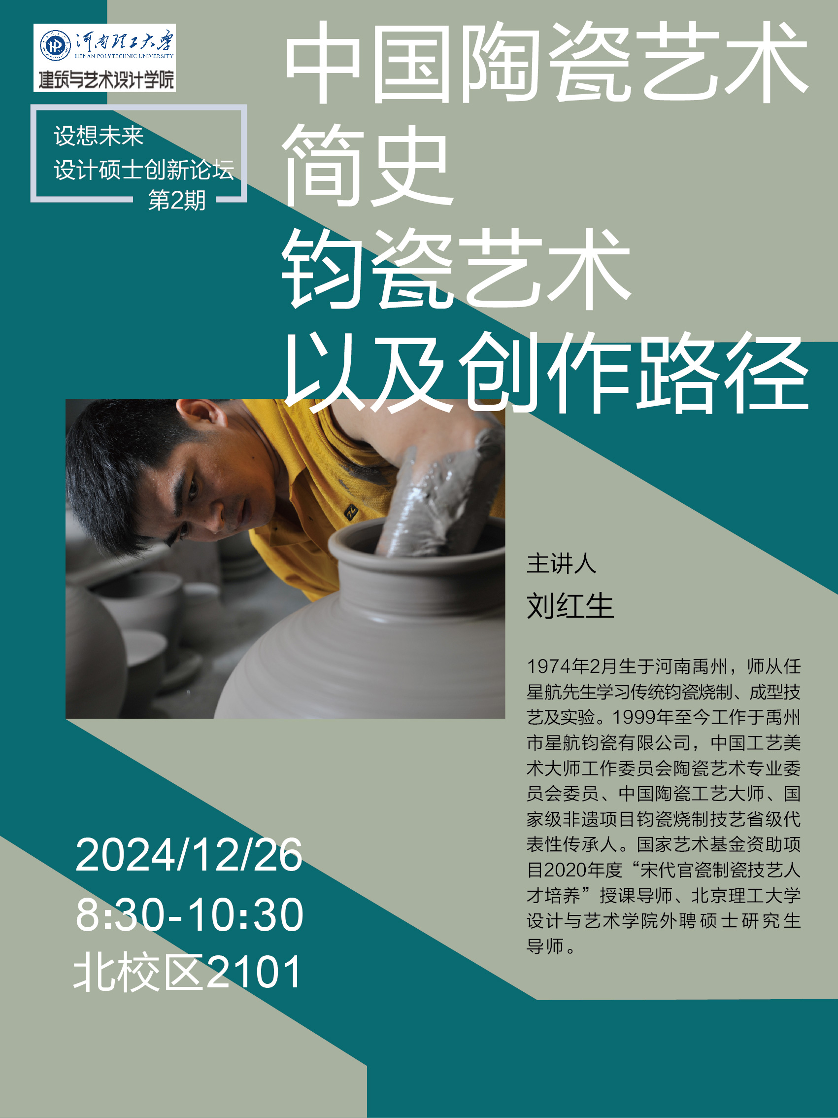 于12 月 26 日上午在北校区2101教室举办 “设想未来”设计硕士创新论坛第2期,本次论坛由视觉传达系主任王海主持,邀请到中国陶瓷工艺大师刘红生作为主讲人,副院长韩宏斌以及相关专业师生到场聆听报告并进行了深入交流。