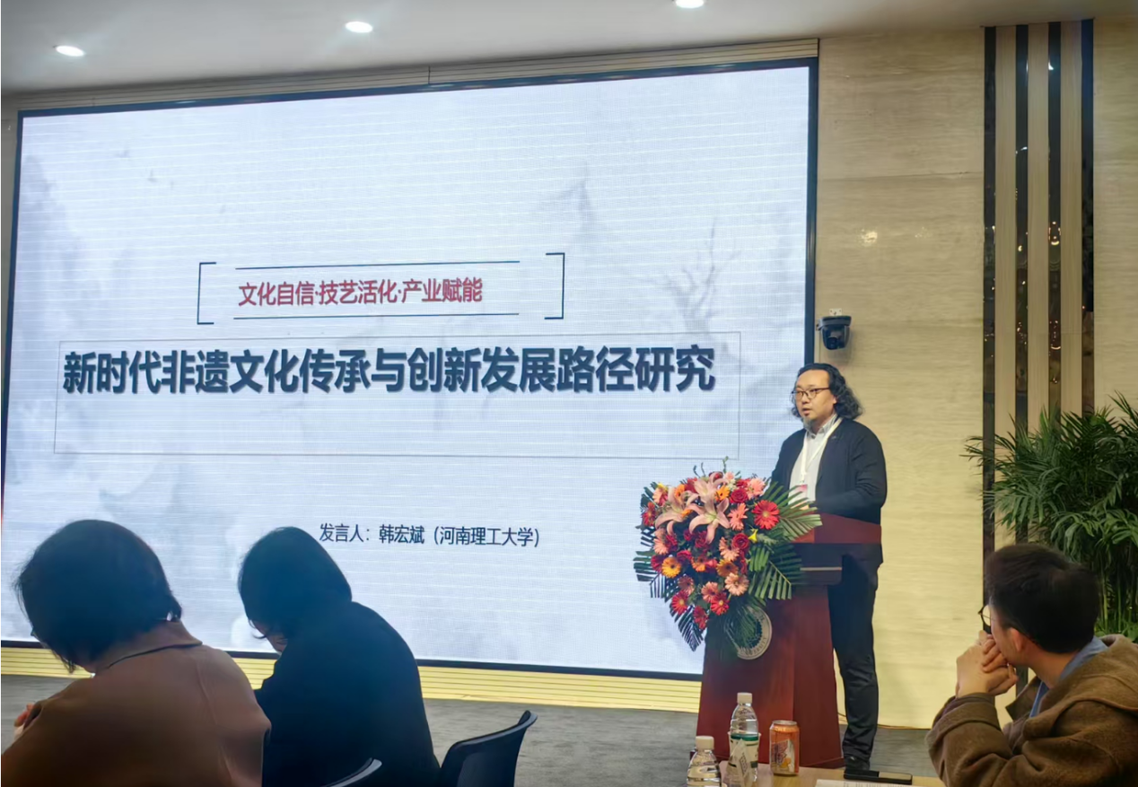 论坛研讨中,韩宏斌做《文化自信・技艺活化・产业赋能——新时代非物质文化遗产传承与创新发展路径研究》主题报告。结合多年实践经验,韩宏斌系统阐述了非遗传承的 “四位一体” 发展范式:以文化基因解码为根基,深入挖掘非遗的精神内核与符号价值,强化文化身份认同;构建“导师制+每日大赛