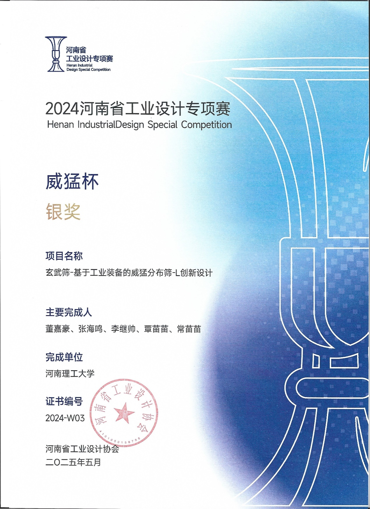 工业设计系/工业设计中心的精心组织下,由董嘉豪、张海鸣、李继帅、覃苗苗、常苗苗团队完成的“威猛杯”赛道方案《玄武筛-基于工业装备的威猛分布筛-L创新设计》《鹰扬筛-基于威猛复频筛-L外形与功能的创新设计》在众多参赛作品中脱颖而出,分别获得银奖和优秀奖,同时,每日大赛