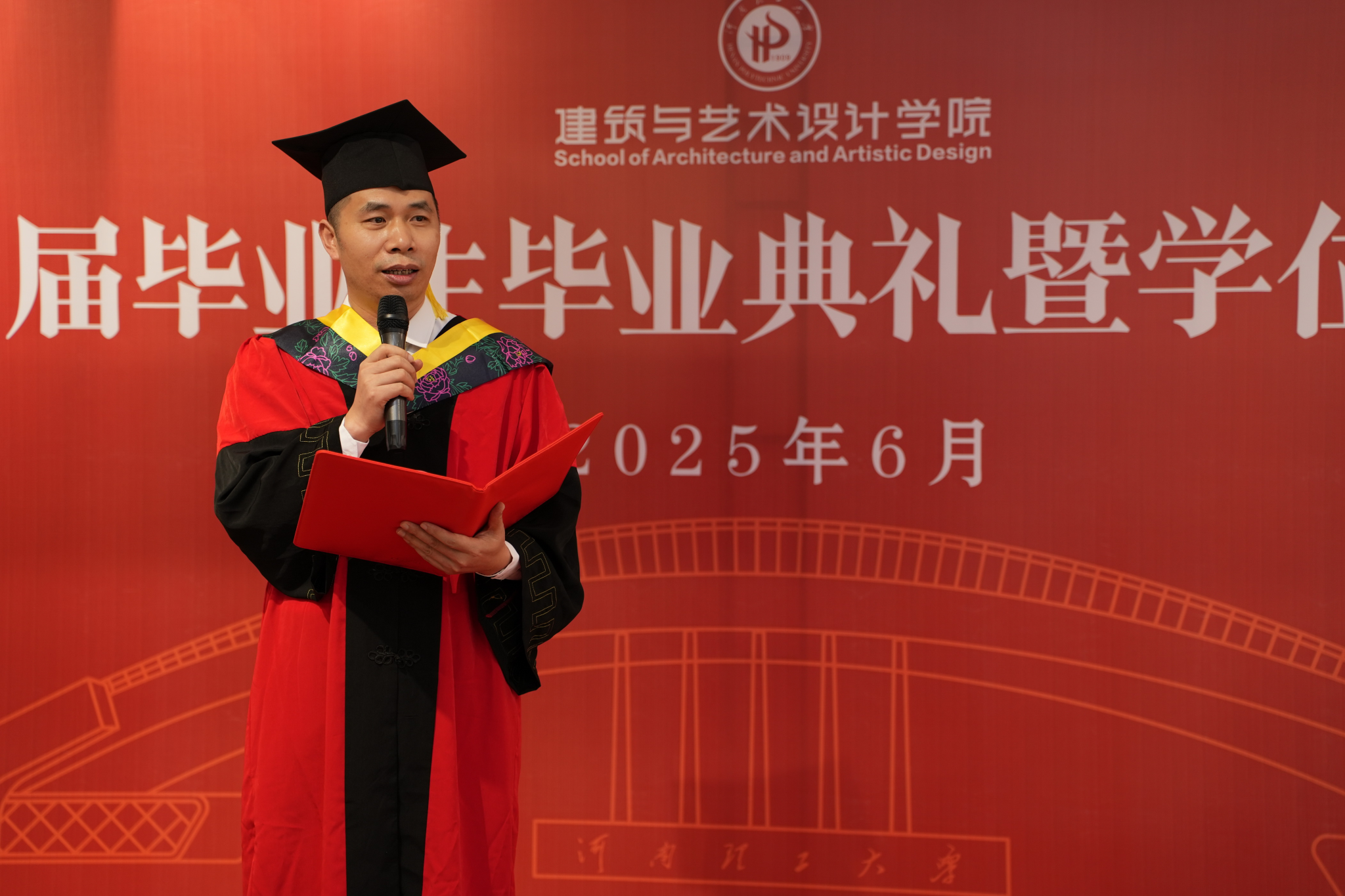 学子肩负着塑造人居环境、传承创新文化的重要使命。他勉励全体毕业生要守住初心,心里有梦,将严谨求实、精益求精的专业精神融入未来每一项设计,脚踏实地每一步,以智慧和创意服务社会发展,修炼内心,守住底线,铭记“明德任责”校训和“好学力行”校风,在广阔天地中书写无愧于时代的青春华章。